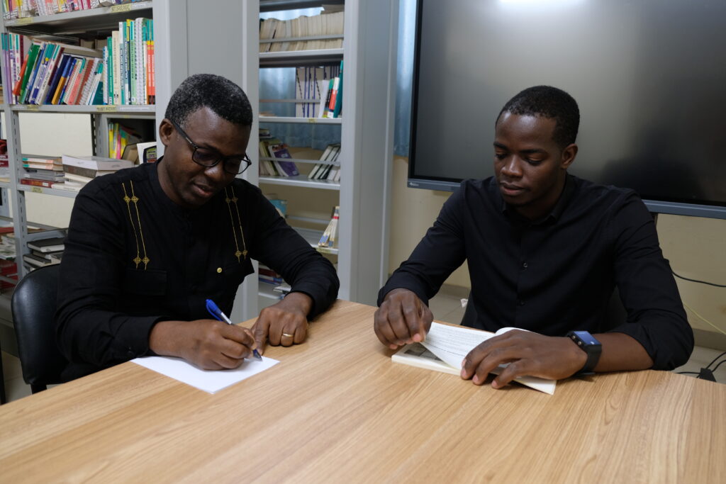 Professeur Abdoulatif Diallo (à gauche) discute d’une étude d’échantillonnage des sols pour détecter la contamination au plomb à l’Université de Lomé au Togo. Crédit image : Photo prise par Alex Brutelle pour The Examination.